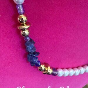 Elegant necklace with pearls and multicolor beads. Features gold accents. Perfect for any occasion.