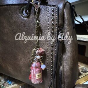 Charming key and card holder with pink and red accents. Features a unique design with a chain and decorative stones. Perfect for adding a touch of elegance to your accessories.