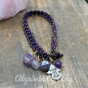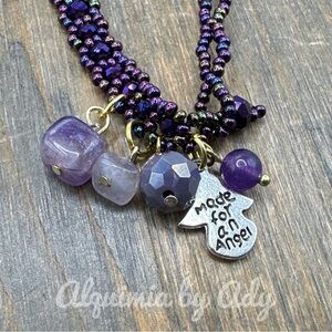 Elegant purple beaded necklace by Alquimia. Features a charming silver pendant and purple beads for a stylish look.