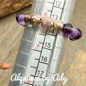Elegant beaded ring by Alquimia. Features purple and gold beads. Perfect for adding a touch of color.