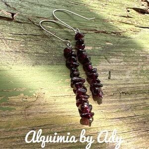 These exquisite Alquimia earrings feature a striking red hue, crafted with natural stones that dangle elegantly below the earlobe. The earrings are designed with a linear arrangement of beads, offering a unique texture and depth. Suspended from simple metal hooks, they add a touch of sophistication to any ensemble.