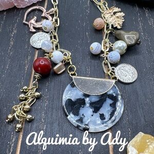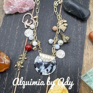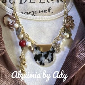 This exquisite Alquimia necklace features a striking crescent-shaped pendant, beautifully complemented by a gold-toned chain. Adorned with vibrant red beads and intricate gold charms, this piece is a perfect blend of elegance and artistry.