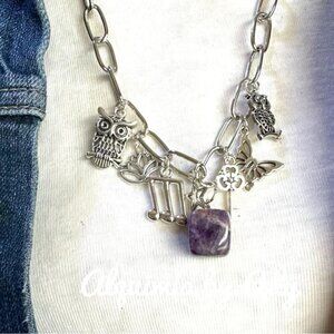 Elegant silver chain necklace with unique charms. Features purple stone and intricate designs. Perfect for adding a touch of sophistication.