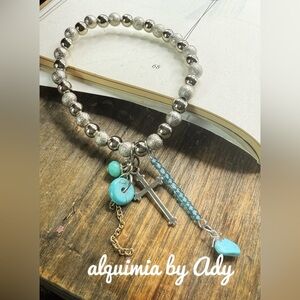 Elegant silver beads with blue accents. Features a cross charm. Perfect for any occasion.