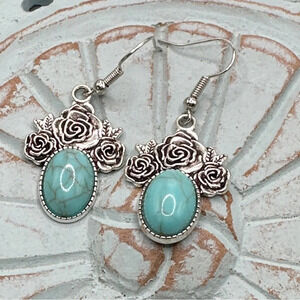 Elegant silver earrings with turquoise stones. Features intricate rose design.