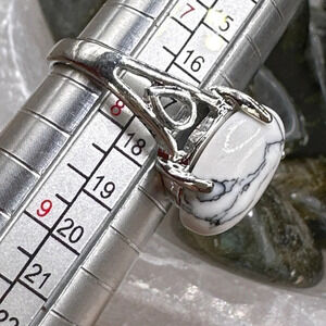 Elegant silver ring with a striking white stone. Unique design with intricate details.