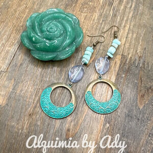 Elegant turquoise earrings with intricate bronze detailing. Features unique bead accents.