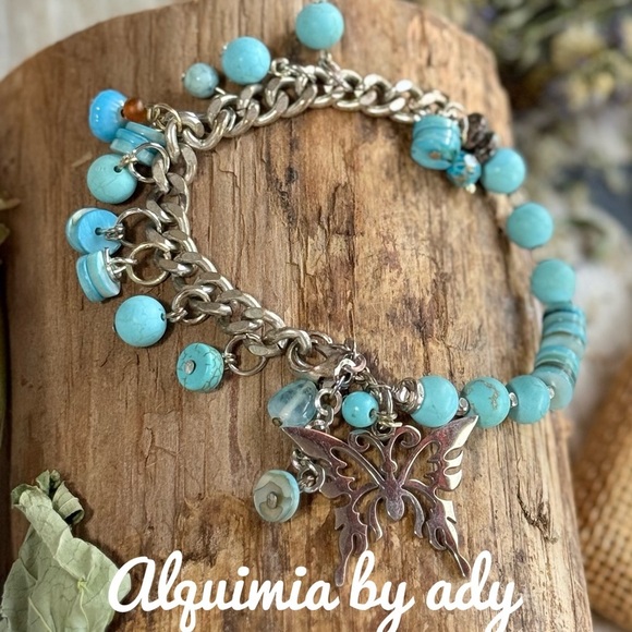 Elegant bracelet with turquoise beads and silver chain. Features a butterfly charm. Perfect for any occasion.