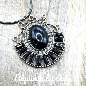 Elegant black and silver necklace. Features a central black stone. Surrounded by sparkling silver accents. Perfect for any occasion.