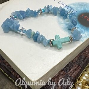 Elegant bracelet with blue gemstones and a cross charm. Perfect for any occasion.