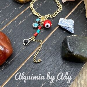 Elegant gold chain necklace. Features vibrant beads in red, blue, and black. Unique design by Alquimia by Ady.