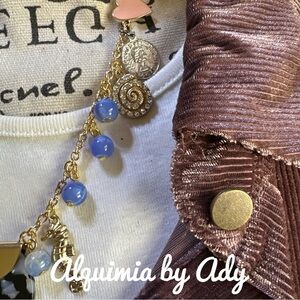 Elegant necklace with gold and blue accents. Features unique charms and beads. Perfect for any occasion.
