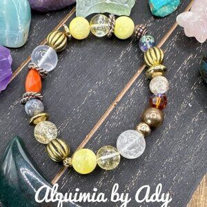 Vibrant bracelet with a mix of beads. Features yellow, clear, orange, and metallic tones. Perfect for adding a pop of color.