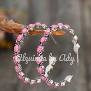 Elegant hoop earrings with pink stones. Silver accents enhance the design. Perfect for any occasion.