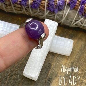 Elegant ring with a vibrant purple stone. Silver band adds a classic touch.