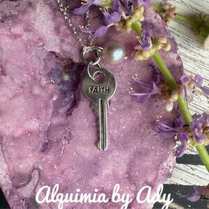 Elegant silver key necklace with 'Faith' engraving. Features a lustrous pearl accent. Perfect for adding a touch of sophistication.