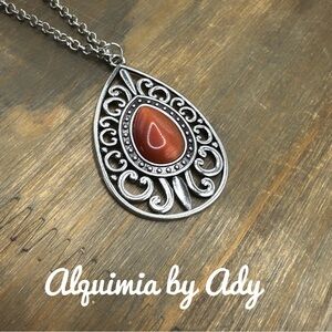 Elegant silver pendant with intricate design. Features a striking red stone centerpiece. Perfect for any occasion.