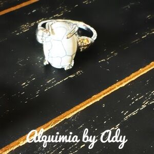 Elegant turtle ring with a silver band. Features a white turtle design. Unique and stylish.