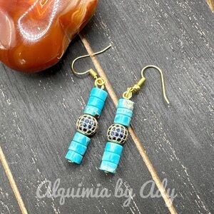 Elegant turquoise earrings with gold accents. Features intricate beadwork.