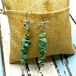 Elegant earrings with green stones and silver bow accents. Perfect for any occasion.
