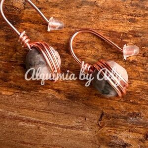 Elegant copper wire-wrapped earrings featuring stunning gray stones. Perfect for adding a touch of sophistication to any outfit. Crafted by Alquimia.