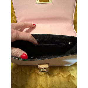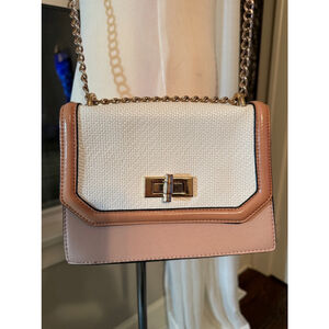 Also Crossbody Bag, White & Pink with gold hardware and a chain strap.
