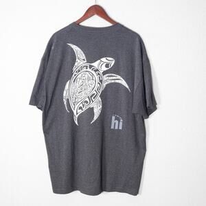 Alstyle men’s graphic t-shirt in soft charcoal cotton featuring the “hi” Hawaii print on the front and a detailed tribal turtle graphic on the back. Men’s size 2XL. Classic crewneck cut with short sleeves and a relaxed fit. Made from 100% cotton with a smooth, breathable texture that makes it ideal for warm weather and travel.