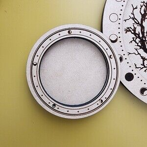 Laser cut and engraved on draft board. Unfinished and can be painted if desired. Etched raven on a skull with the moon phases around the outer edge. Three places to put candles. Do not put candles directly on the wood place them in a fire-safe candle holder first.
