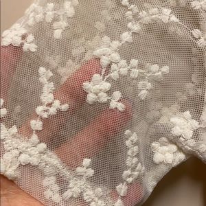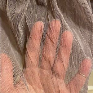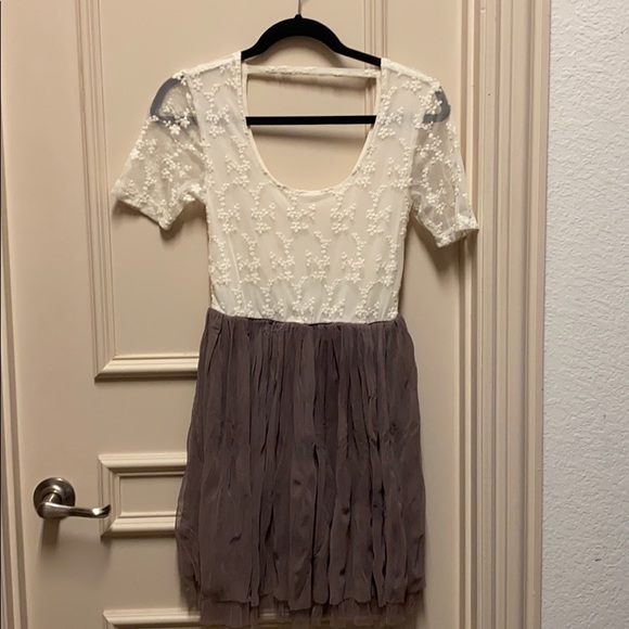 Altar’D State babydoll style dress. The top is cream colored lace over soft t-shirt like material. The bottom is two layers of chiffon (I think) and one layer of satin, all plum colored. The picture doesn’t do it justice!
