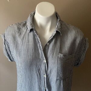 Altar’d Blue Striped Linen Blend Short Sleeve Raw Hem Button Down Blouse Size XS