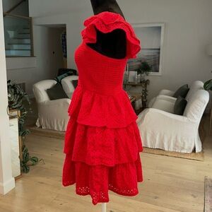 This adorable red mini dress features a tiered ruffled eyelet skirt, very stretchy top with ruffled flutter eyelet straps.