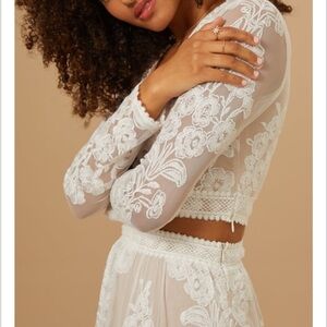 Long sleeve floral embroidered top featuring a flattering v-neckline and sheer long sleeves radiates a sense of effortless elegance.