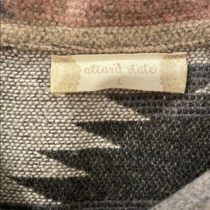 Stylish Aztec patterned button-up jacket with front pockets. Features a blend of gray, black, and pink tones.