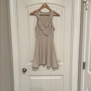 Stylish mini dress with ruffled collar. Sleeveless and elegant. Ideal for casual wear.