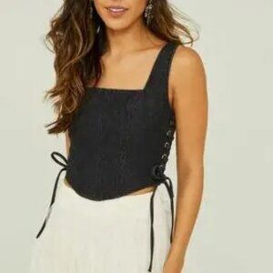 Altar'd State Black denim cropped corset top with lace-up side detail and zip up back. Chic black crop top with lace-up sides. Perfect for a trendy look. Excellent condition, black denim, size Small. Cottage, Couqette, denim, Corset, Crop Top, Tank Top