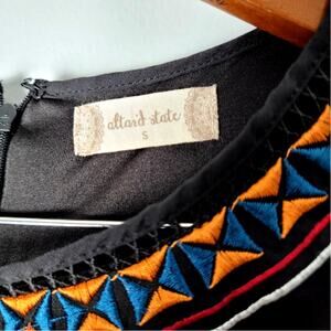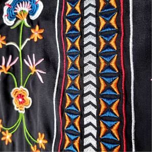 Beautiful Altar’d State black dress in size small featuring stunning colorful embroidery across the front, sleeves, and neckline. The long sleeves are accented with smocked mesh panels for a flattering and romantic fit. Back zipper closure. Perfect for fall festivals, moonlit strolls, or cozy gatherings. Lined body with unlined sleeves for a light, breathable wear.