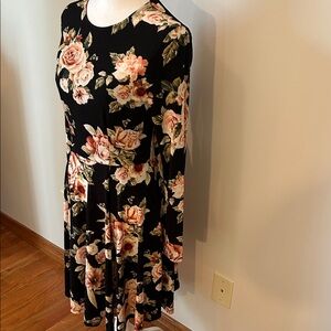 Chic black dress with vibrant floral design. Long sleeves add elegance. Ideal for versatile styling.