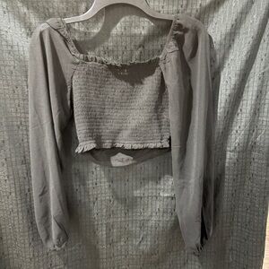 Chic black blouse with ruched front. Long sleeves and square neckline. Perfect for versatile styling.