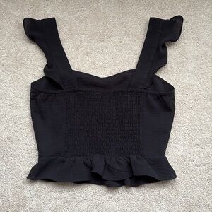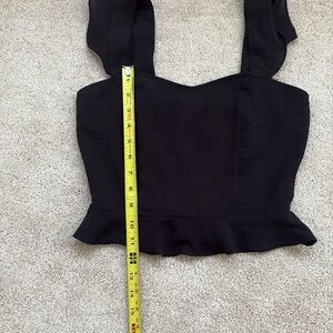 Chic black tank top with ruffle straps. Perfect for stylish outings.