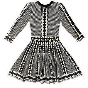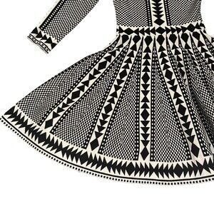 Keywords: Cocktail, Casual, Workwear, Bohemian, City, Modern, Skater Dress, Geometric, Tribal Pattern, Black and White, B&W, Long Sleeve, 3/4 Sleeve, Mini Dress, Sweater Dress, Knit Dress, Fit and Flare.