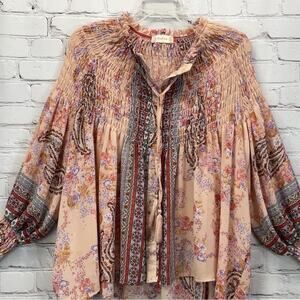 Altar’d State Blouse Women's Size S Peach Floral Paisley Boho Smocked Button Up