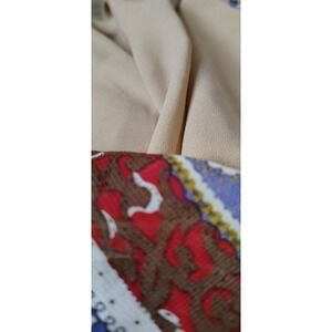 This bohemian-style sleeveless dress features a relaxed, flowy silhouette with a soft beige central panel framed by richly patterned side panels in red, blue, and cream tones. The hemline is asymmetrical with a handkerchief cut, adding movement and a whimsical touch. The neckline is adorned with intricate crochet lace detailing in off-white, accented with decorative cutouts and fringe, enhancing the vintage-inspired, free-spirited aesthetic.