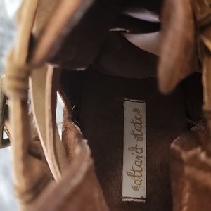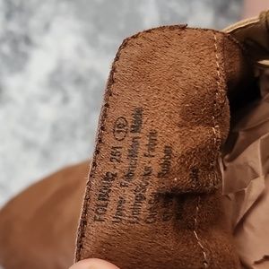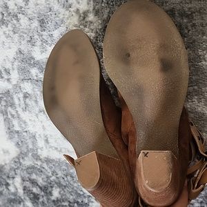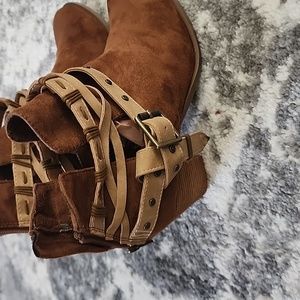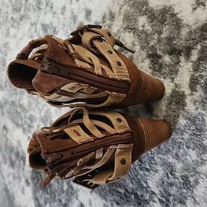 cognac colored suede bootie with ankle strap detailing. zippered back and 3" heel