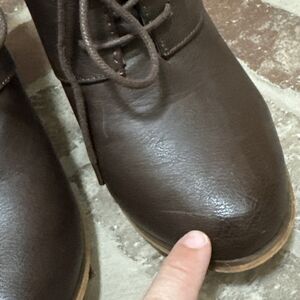 Bottoms of shoes are scuffed. Scratch on toe - see in photo