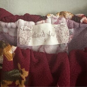 Great Preowned Condition. Brand is Altar’d State. It is a jumpsuit so it is a one piece with pants (not a dress). Can be worn on or off the shoulder. The collar is stretchy. The most narrow part of the waist has a stretch band. The main background color is a burgundy/maroon color. Floral and leaf print. Made in Vietnam.
