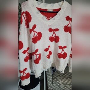 Altar’d State Cherry Fuzzy Oversized Distressed Sweater
