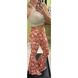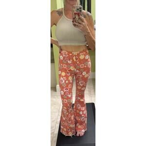 Step back in time with these Altar'd State Cindy Retro Flare Pants! These bellbottoms feature a stunning pink and coral floral pattern that's sure to turn heads. Perfect for adding a touch of vintage flair to your wardrobe. flat lay waist 24 inch, rise 10 inch inseam 31 inch