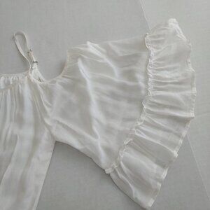Size small Altar'd State white cold shoulder shift dress with floral embroidered details. Bell sleeves boho style with adjustable shoulder straps. Fully lined 100% polyester. Self 100% rayon pit to pit 18" Dress length approximate 30". Excellent pre-owned condition with no visible flaws