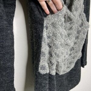 Super cool sweater by Altar'd State. Charcoal gray sweater tunic with a cowl neckline. Crochet type textured fabric attached at front in a swag in a lighter gray. Longer tunic length. Very unique! All measurements are approximate and taken flat.