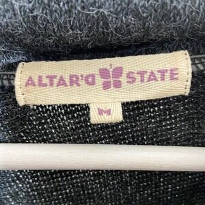 Super cool sweater by Altar'd State. Charcoal gray sweater tunic with a cowl neckline. Crochet type textured fabric attached at front in a swag in a lighter gray. Longer tunic length. Very unique! All measurements are approximate and taken flat.
